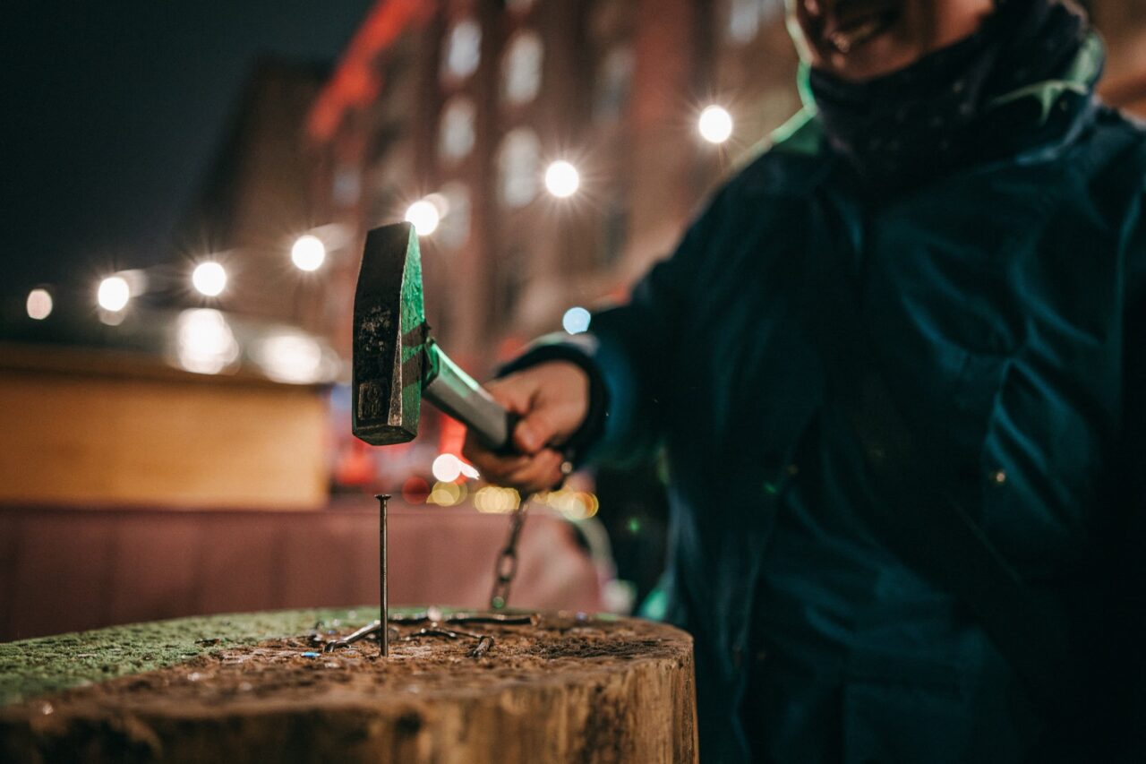 Mit einem umgedrehten Hammer galt es, den Nagel in wenigen kräftigen Schlägen tief ins Holz zu schlagen.